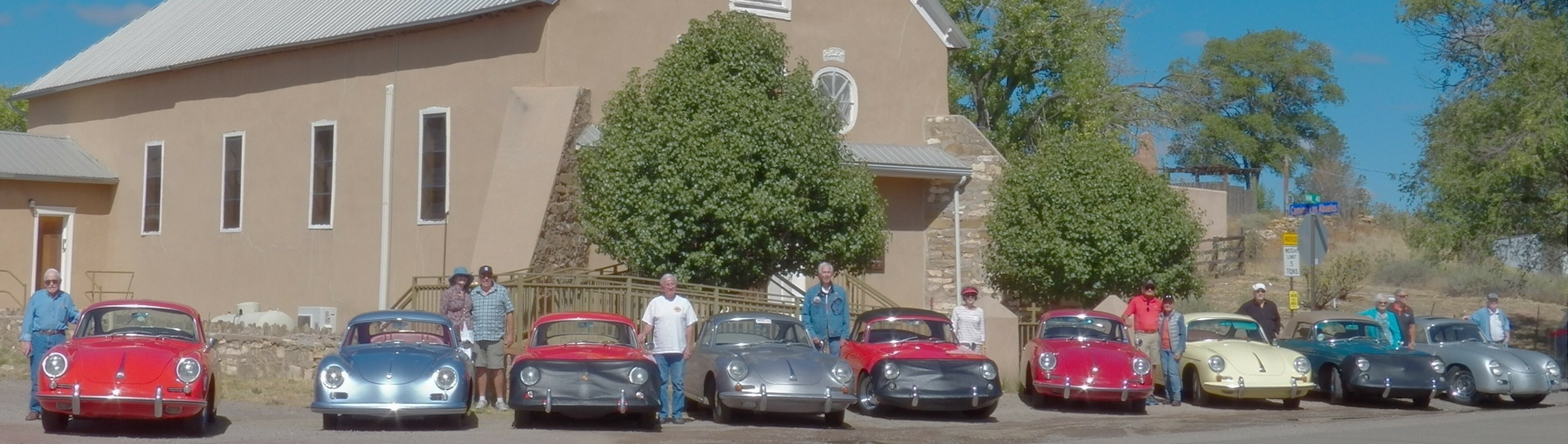 The most fun Drive Your 356 Day photo - thank you John Hogan from the ZIA Club Drive out and stop at Adobe Church in Galisteo, NM (Picture by Jim Puckett) -Bill Oaks, 1964 Red 356C Coupe, Christe & John Price, 1954 Blue 356 Pre-A Continental, Joe Almers, 1959 Red 356A Coupe, Dave Stinchcomb, 1964 Silver 356C Coupe, Bonnie Clark, 1963 Red 356B Cabriolet, Joanne & George Dietrick, 1965 Red 356SC Coupe, Jack Lerner, 1965 Yellow 356C Coupe, Julie & Gary Wolf, 1963 Green 356B Cabriolet, John Hogan, 1957 Silver 356A Sunroof Coupe